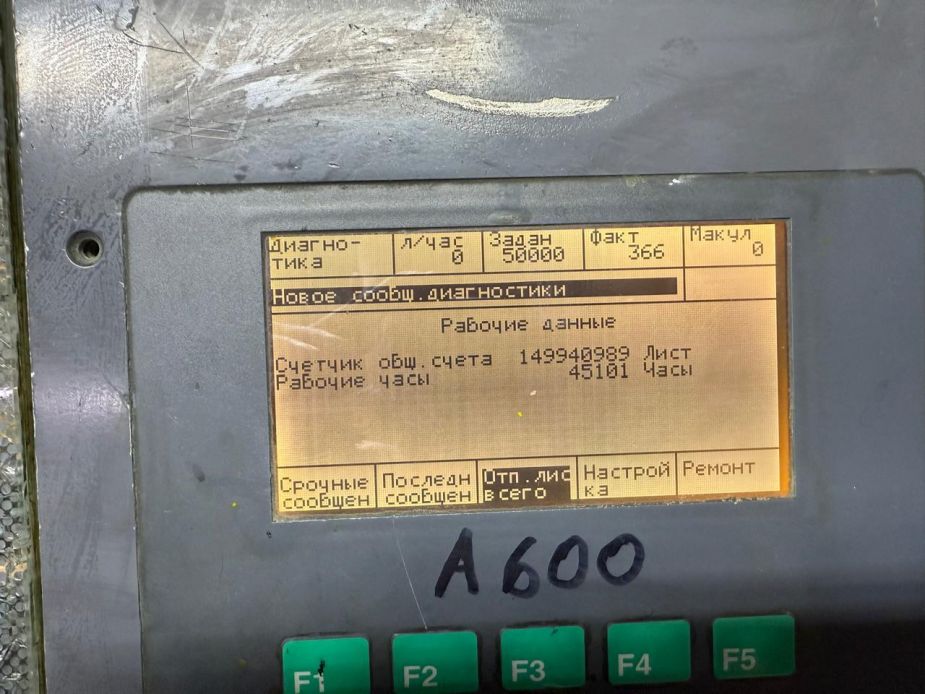 год выпуска 2006, пробег 150 млн, Формат листа: макс. 520х740 мм, мин. 210х280 мм площадь запечатываемой поверхности: 510х735 мм формат печатной формы: 605х740 мм формат офсетного полотна: 655х760 мм (длина х ширина) толщина материала: до 0,8 мм высота стапеля (наклад) 1245 мм высота стапеля (вывод) 500 мм скорость: 13.000 листов / час Распылитель противоотмарочного порошка Weko T66C картонопроводящая система вакуумный стол система контроля двойного листа
