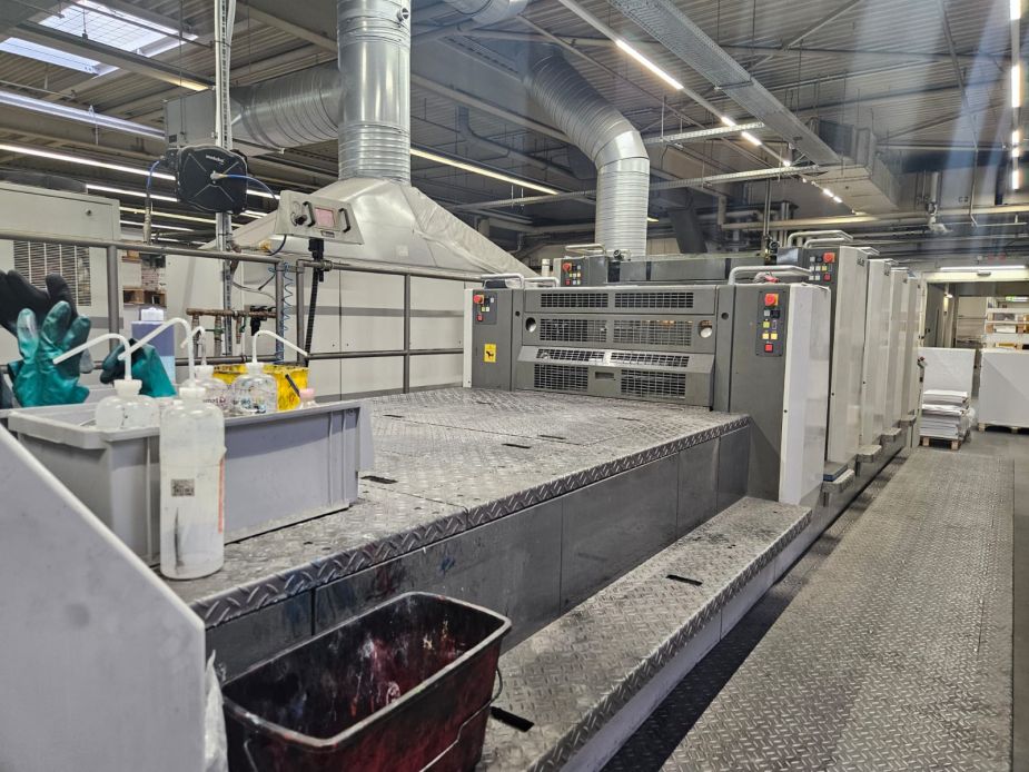 год выпуска 2009, Пробег 145 million: Комплектация - PQC with PDC 2 measuring Komorimatic damping APC AMR Programmable blanket/roller/imp. cylinder wash Harrois and Bruno Cameracle coater Tresu Litho Coat coating circulation unit Steel plate in feed and delivery Skeleton transfers Electronic sidelays Ultrasonic 2 sheet detector Grafix Digitronic 3000 Powder Spray Baldwin Graphiset IR Dryer Technotrans Alpha C Combined Refrig./Ink temperature control (air cooled) Alcocontrol Lithocoat system for coating heating/ flush Extended delivery Under power (Germany)
