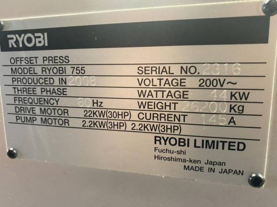 год выпуска 2008, пробег 116, Max. Sheet Size: 788 x 600 mm. • Grafix Powder Spray Unit IR/HA. • Harris & Burno LC2 (Lithocoat) Coating Pump System. • Open Type Doctor Blade Coating System. • RYOBI PCS-G Printing Control System. • RYOBI Program Inking. • Ink Volume Setter-CIP4. • PDS-E Spectro Auto. • Paper Size Preset System. • Semiautomatic Plate Changer. • Pull Guide Preset System. • RYOBI-matic-D. • Tresu/Royse DWC 20-3 Circulator. • Ink Oscillating Form Roller. • Plate Register Remote Control Device (Vertical, Lateral, Diagonal) • Automatic Blanket Cleaning Washer • Automatic Impression Cylinder Washer • Static Eliminator (Blower type at the feeder side) • Suction Tape Feeder Board. • Pull Side Guide Suction Wheel. • Side Lay Sensor. • Front Lay Blower • Double Sheet Detector (Mechanical) • Ultrasonic Type Double Sheet Detector • Skewed Paper Detector • Paper Transfer Jam Detector • Delivery Jam Detector • Delivery Decurling Device • Non stop Delivery Racking System Long double delivery ( E ) • Non stop Feeder • Skid Type Paper Pile Board. • Light weight paper feeding kit