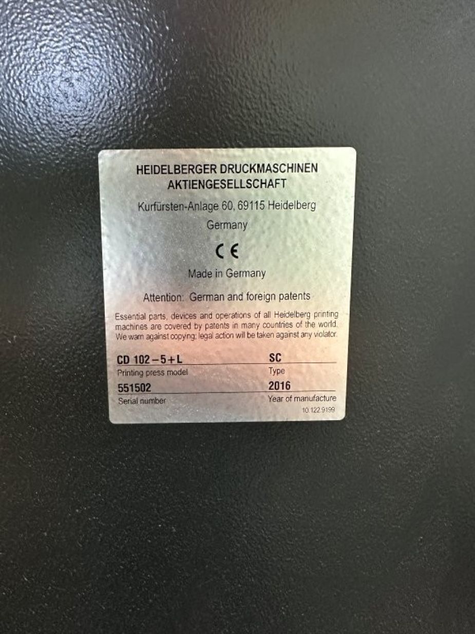 год выпуска 2016, пробег 96 млн, Press Center Compact; Easy control, spectral measuring device; Alcolor dampening units with Technotrans CombiStar BETA C 170; Technotrans Alcocontrol; Heidelberg Autoplate; Preset Plus Feeder; Preset Plus Delivery; Automatic wash-up devices for inking rollers; Automatic wash-up devices for blanket and impression cylinders Technotrans inking unit temperature control; Dedicated coater with chambered doctor blades TRESU; X1 delivery with IR Dryer DryStar 2; Non-Stop feeder with poles; Non-Stop delivery with racks; Anti-Static Compact feeder and delivery; Steelplate feeder and delivery; Weko AP 262 powderspray; Scroll Star Plus II; AirStar Pro watercooled; Watercooled machine with Technotrans Beta. PS and chiller.