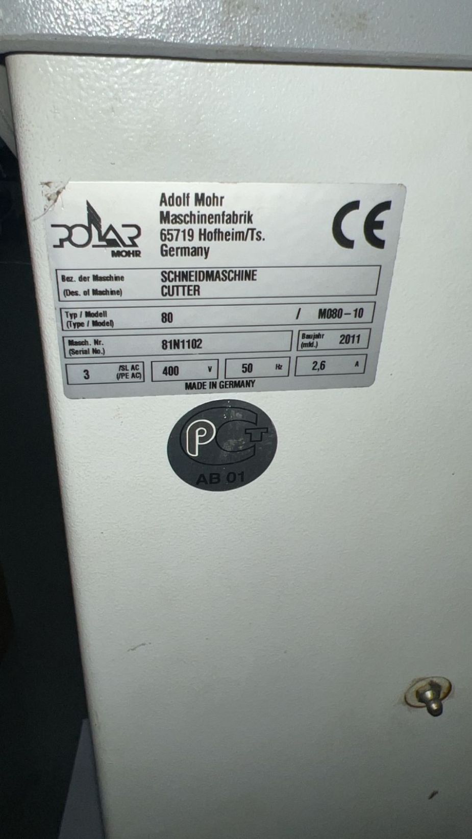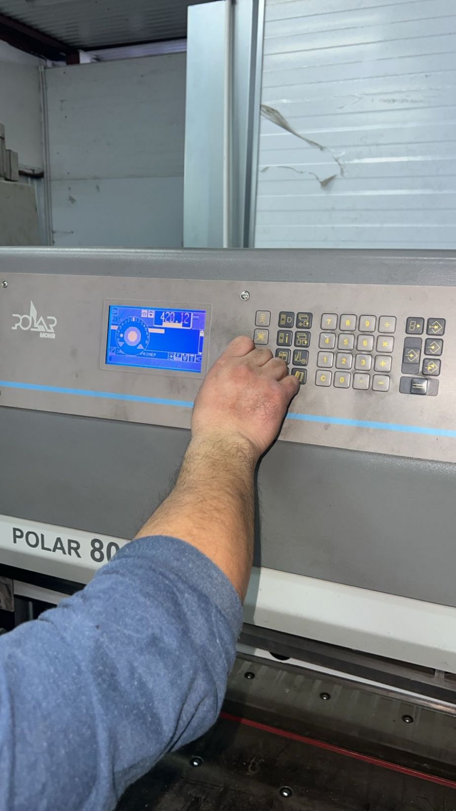 год выпуска 2011, длина реза — 80 см; высота стопы — 10 см; глубина стола — 80 см; усилие прижима: мин. — 200 daN, макс. — 2700 daN; мощность электродвигателя — 4,5 кВт, 400 В, 50 Гц, 3 Ф; максимальная скорость опускания ножа — 25 резов в минуту; толщина ножа — 9,7 мм; минимальный остаточный рез: без прижимной планки — 20 мм, с прижимной планкой — 50 мм; скорость движения подавателя — 13 см/с; количество программ в памяти — 99.