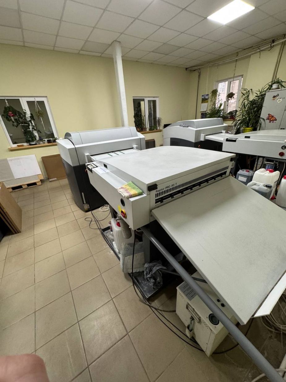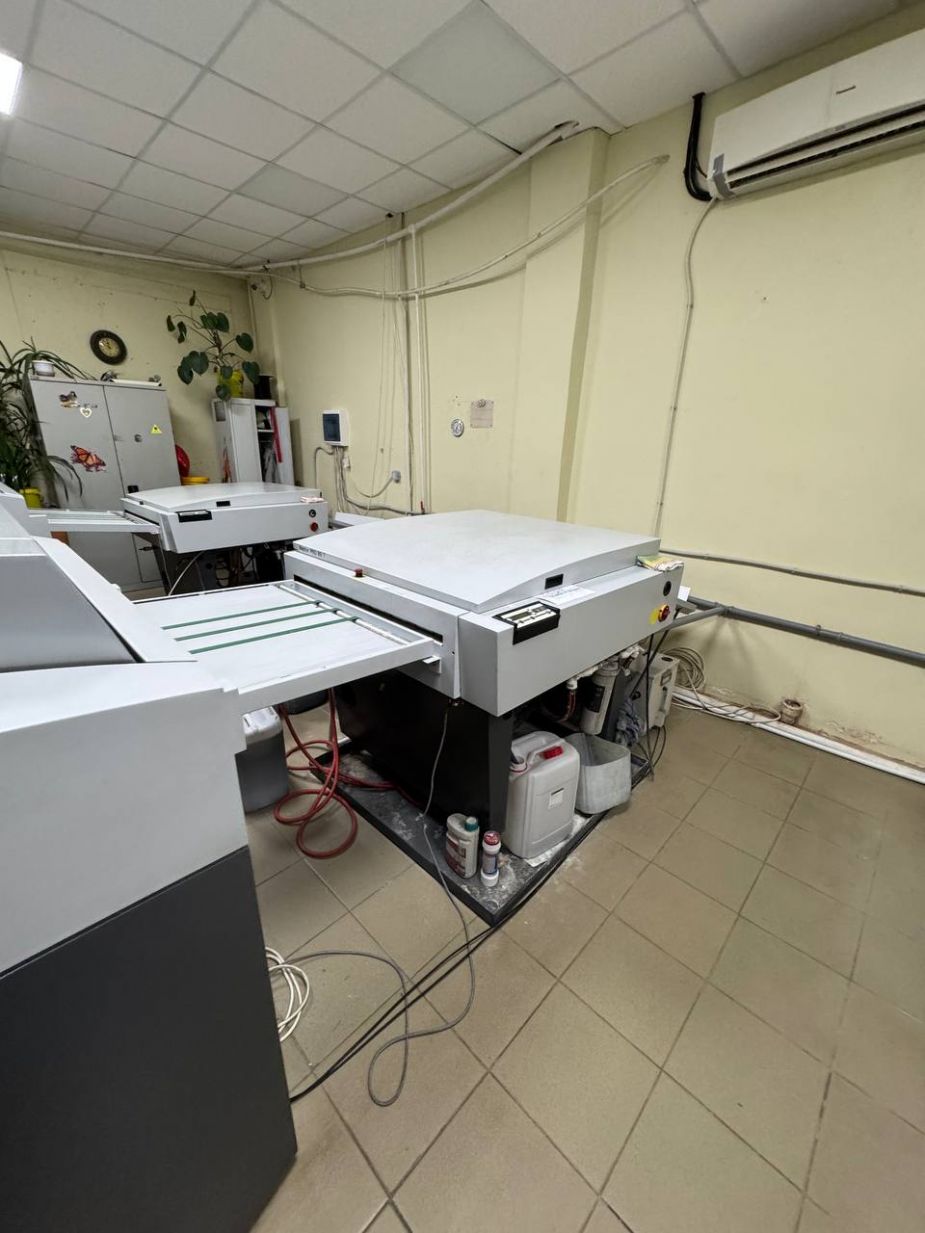 г.в. 20011, он лайн проявка G&J Raptor 85, Metashooter, Metadimention, пробивка штифтов, Скорость работы: 17 пластина в час. Максимальный и минимальный размер пластин: 670×760 мм / 240×240 мм. Разрешение: 2400 или 2540 dpi. Толщина печатной формы: 0,15–0,3 мм.