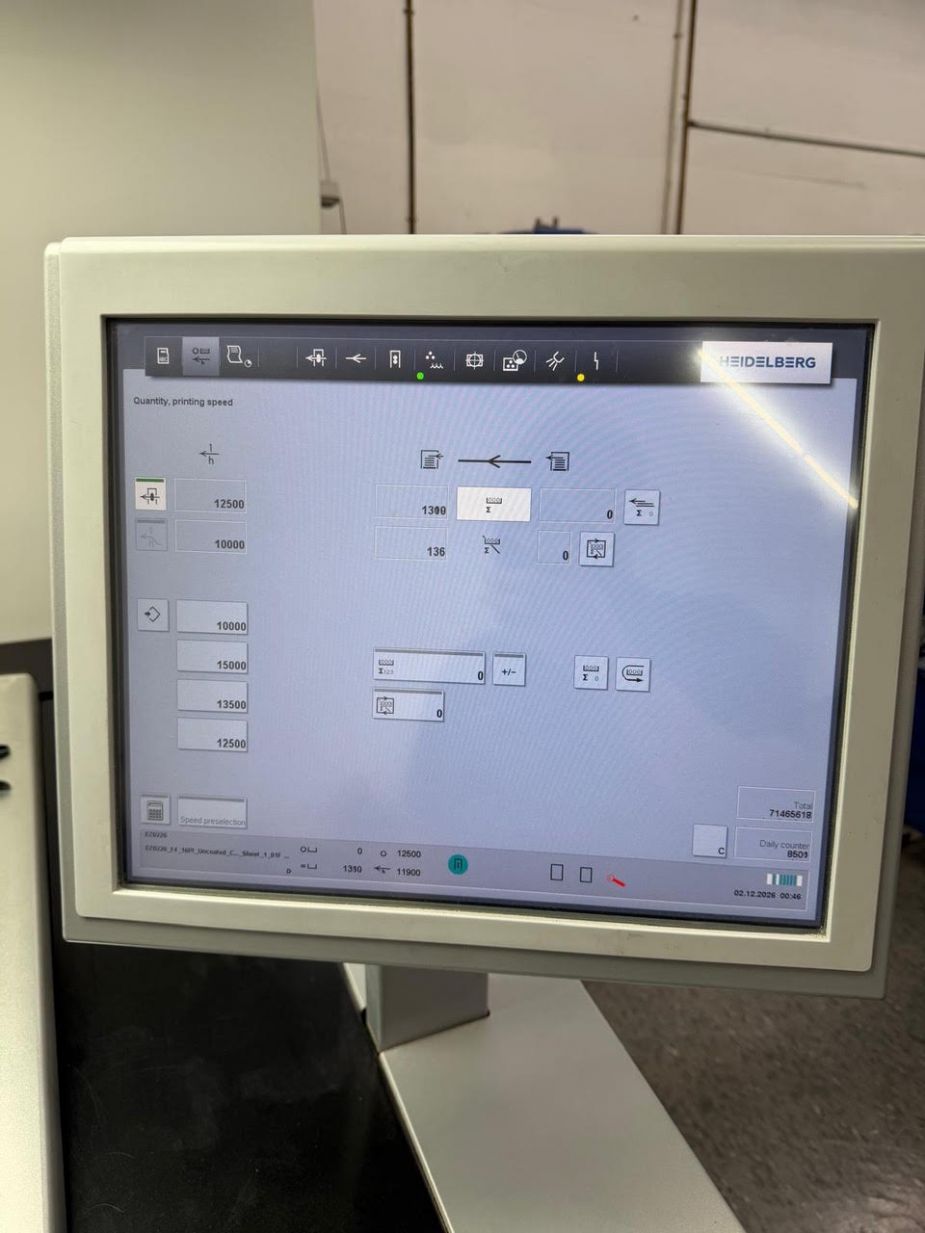 Год выпуска 2016, пробег 71 млн, Prinect Press Center 2 console Alcolor Dampening Combistar Recirculation Anilox Roller Coater Easycontrol Measuring Device Programmable Autowash up Devices Autoplate X2 Extended Delivery Drystar Combination Carton DRyer Weko AP 110 Powder Spray Preset Plus Feeder Preset Plus Delivery