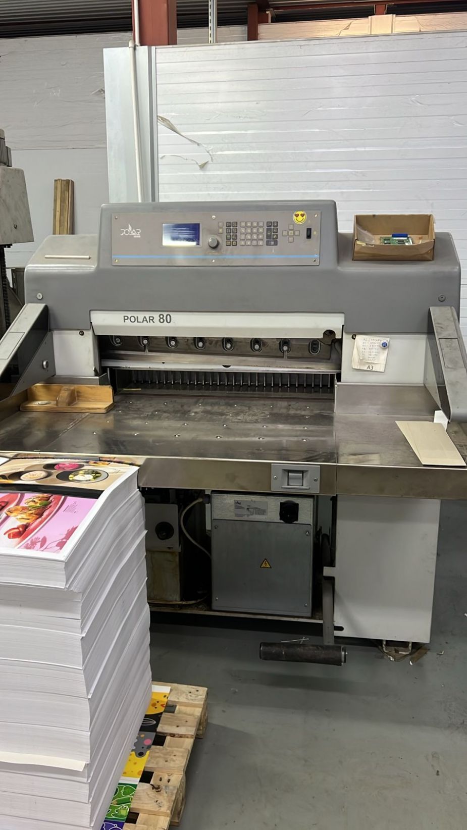 год выпуска 2011, длина реза — 80 см; высота стопы — 10 см; глубина стола — 80 см; усилие прижима: мин. — 200 daN, макс. — 2700 daN; мощность электродвигателя — 4,5 кВт, 400 В, 50 Гц, 3 Ф; максимальная скорость опускания ножа — 25 резов в минуту; толщина ножа — 9,7 мм; минимальный остаточный рез: без прижимной планки — 20 мм, с прижимной планкой — 50 мм; скорость движения подавателя — 13 см/с; количество программ в памяти — 99.